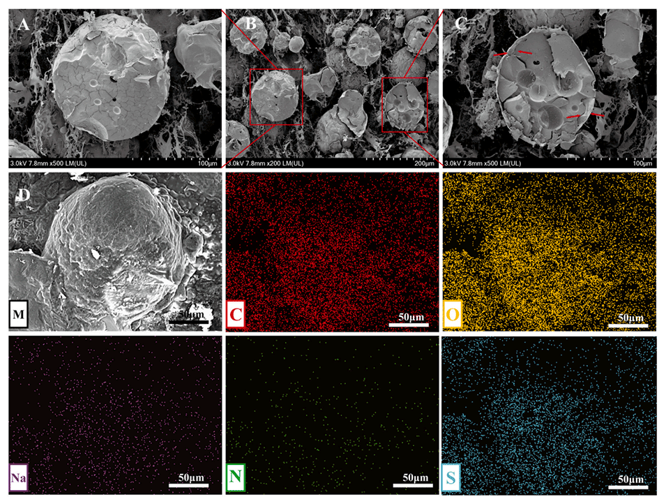图5.微胶囊低温扫描电子显微镜(A)(B)(C)。微胶囊的能量色散光谱(EDS)图(D)。