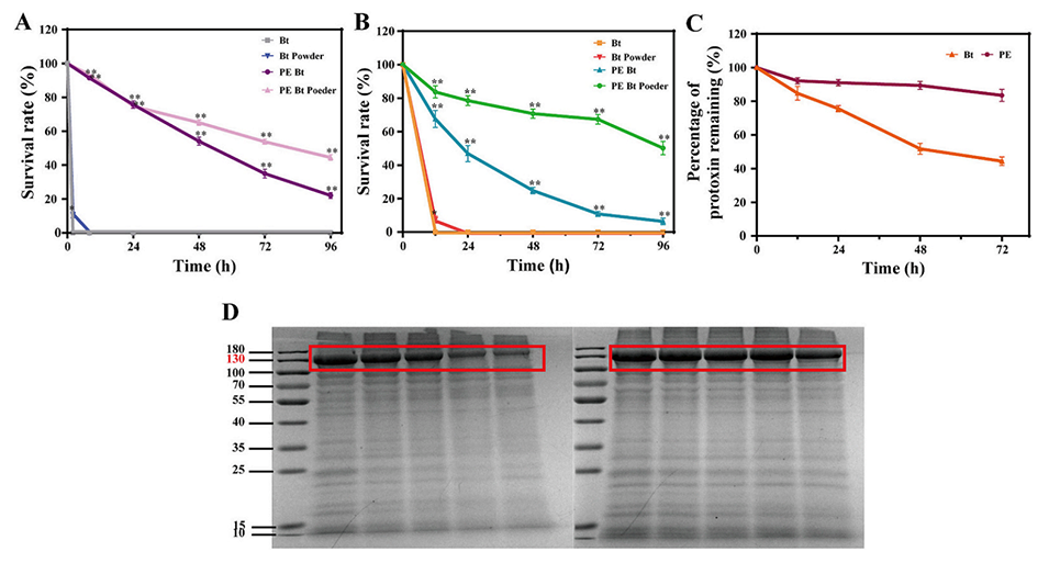 图7.紫外线照射下Bt发酵液、Bt粉、Bt微胶囊、Bt粉末微胶囊(A)和孢子(B)的存活率。杀虫蛋白Cry1Ac在紫外线照射下的保留率(C)和SDS-PAGE图谱(D)。