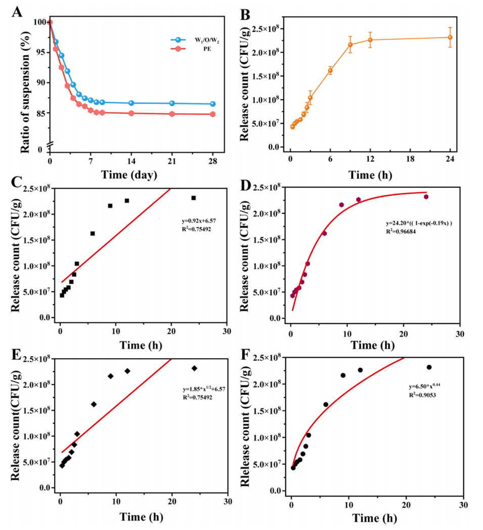 图9.不同悬浮比例的微胶囊和双乳液(A)。封装在微胶囊中的Bt细菌的释放曲线(B)。微胶囊释放动力学模型,零级释放动力学(C),一级释放动力学(D),Higuchi模型(E),Ritger-Peppas模型(F)。