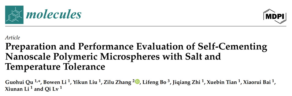 近期,东北石油大学曲国辉副教授等人成功制备了一种耐温耐盐的自胶结纳米聚合物微球。通过引入耐温耐盐单体(如2-丙烯酰胺-2-甲基丙烷磺酸,AMPS),并采用核壳结构设计,微球在高温高盐油藏中展现出良好的膨胀性能和封堵能力,显著提升了调剖效果和采收率。相关研究以“Preparation and Performance Evaluation of Self-Cementing Nanoscale Polymeric Microspheres with Salt and Temperature Tolerance”为题目,发表在期刊《Molecules》上。