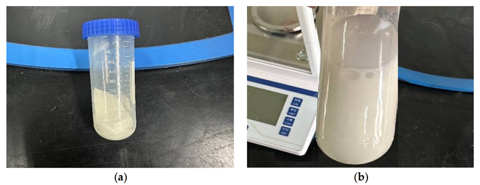 图6.聚合物微球的外观形态。(a)微球干粉;(b)微球乳液。