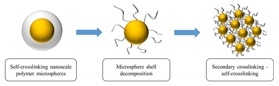 2、为了增强其自凝性,微球被设计为核壳结构。壳层含聚合物表面活性剂脂肪醇聚氧乙烯醚甲基丙烯酸酯(AEOMA),这是一种热敏交联剂,在壳分解时能够自交联,解决了与储层孔喉尺寸的兼容性问题。