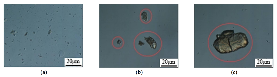 图9.在不同分散剂下微球的光学显微镜观察。(a)纳米球——再注入水;(b)纳米球——无水乙醇;(c)纳米球——煤油。