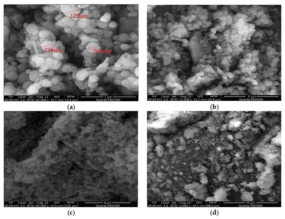 图8.聚合物微球的扫描电子显微镜图像。(a)1μm;(b)3μm;(c)5μm;(d)10μm。