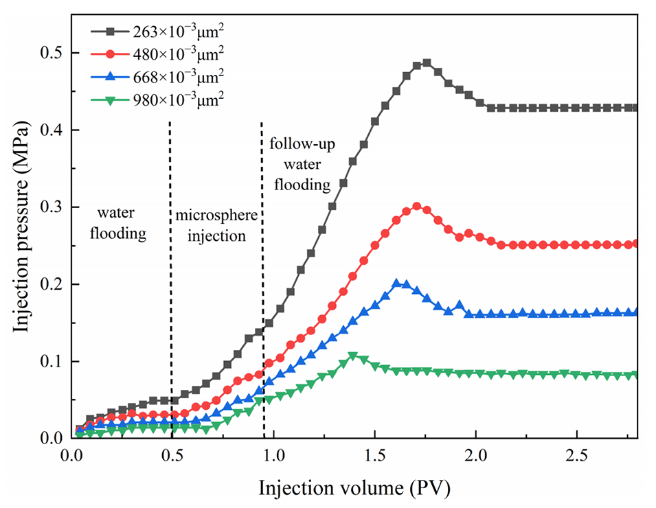 图15.在不同渗透率下聚合物微球的注入压力变化。