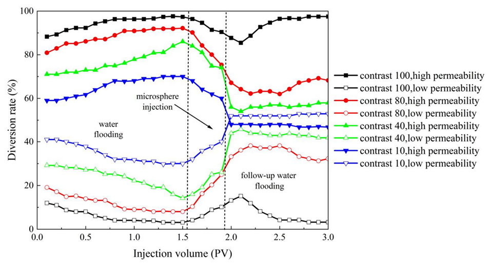 6、这些微球在低渗透油藏中表现出优异的封堵性能,同时有效改善了渗透率差为10~80的油藏的吸水剖面,进而有效提升了采收率。