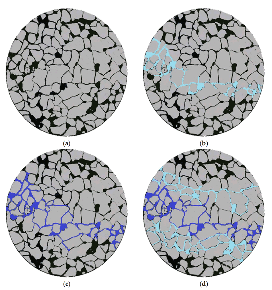 图18.玻璃刻蚀模型驱油效果图的微观模拟。(a)初始状态;(b)水驱;(c)微球注入;(d)后续水驱。