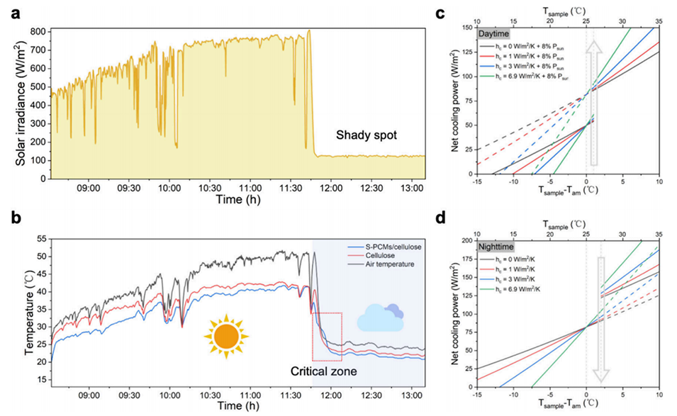 图5在上海理工大学屋顶进行的S-PCMs/纤维素复合薄膜的户外实时冷却测试。