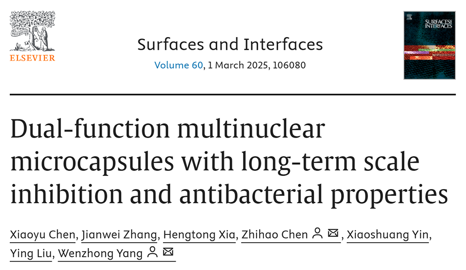 结垢和生物污染是工业循环冷却水系统中的两大关键问题,直接使用液体阻垢剂和杀菌剂往往无法提供长期有效的控制,并导致药剂的大量浪费。近期,南京工业大学杨文忠教授、陈智豪博士等人采用双乳液(W/O/W)结合原位聚合技术开发了一种双功能多核微胶囊,同时封装HEDP阻垢剂和丁香油杀菌剂,旨在解决工业循环冷却水系统中的结垢和生物污染问题。相关研究以“Dual-function multinuclear microcapsules with long-term scale inhibition and antibacterial properties”为题目,发表在期刊《Surfaces and Interfaces》上。