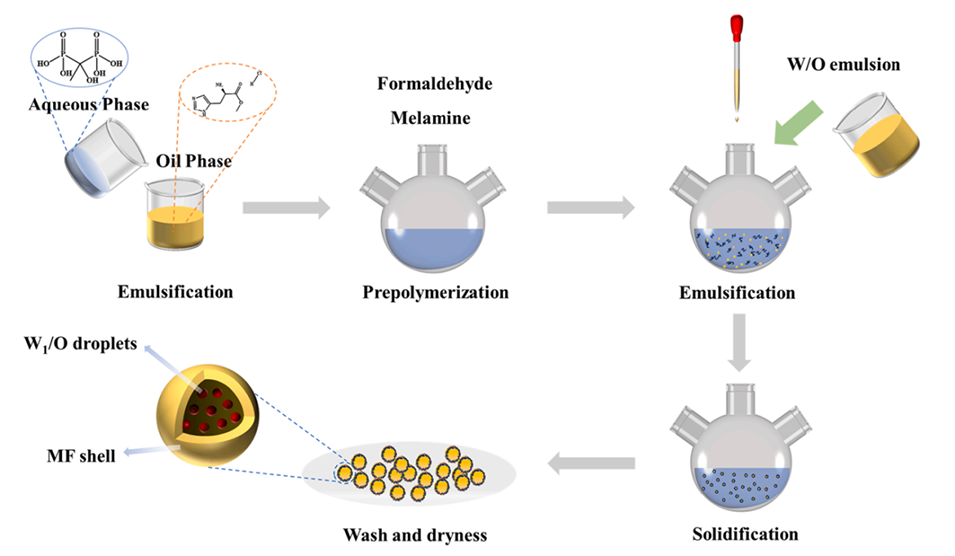 3、形成微胶囊:将W1/O小液滴缓慢添加到PMF溶液(W2)中,机械搅拌(800 rpm)并乳化30分钟。乳化后,逐渐调节溶液pH至3.5-5引发PMF的聚合反应,形成微胶囊外壳,并在70℃水浴中磁力搅拌反应5小时。待反应结束,将产物在8000 rpm下离心5分钟,收集沉淀,并用去离子水和酒精分别清洗三次,最后在60℃下干燥即可。