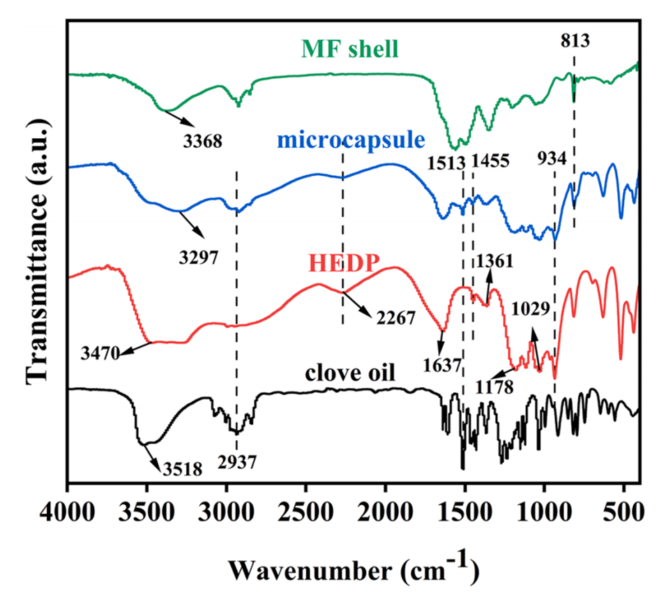 图3.丁香油、HEDP、MF壳和MCH微胶囊的傅里叶变换红外光谱(FTIR)。