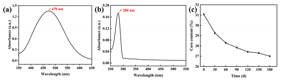 图4.(a-b) MCH微胶囊中HEDP和丁香油的紫外吸收曲线,(c)在室温下存放半年对MCH微胶囊核心含量的影响。