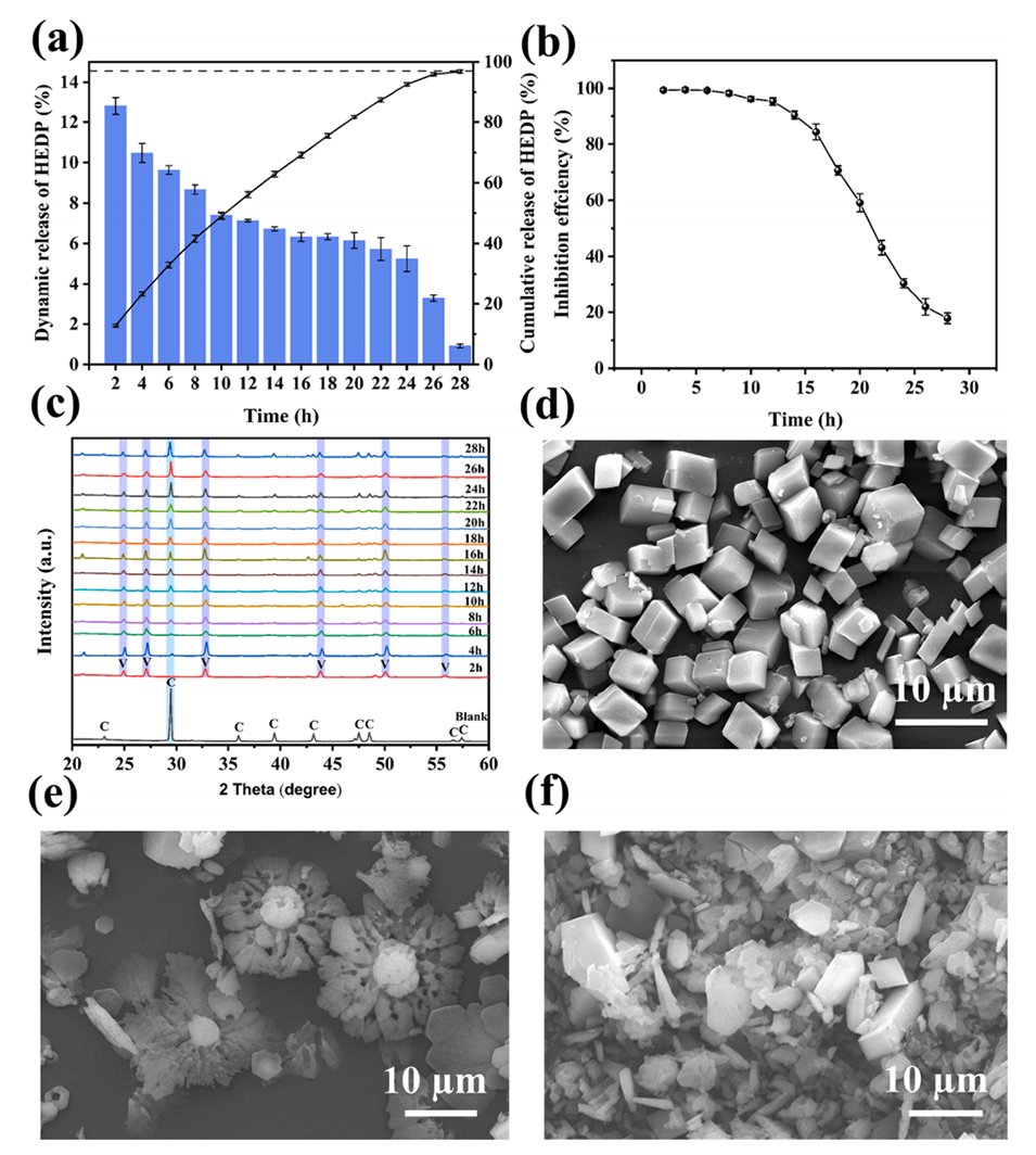 图7.(a) HEDP的动态释放曲线和累积释放百分比,(b)结垢抑制效率,(c)不同动态释放时间的XRD图谱,(d)空白组中的CaCO3沉淀的SEM图像,(e-f)动态释放2小时和28小时的CaCO3沉淀的SEM图像。