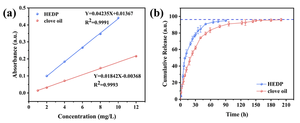 图6.(a) HEDP和丁香油的标准曲线,(b)微胶囊中包封的HEDP和丁香油的持续释放行为。