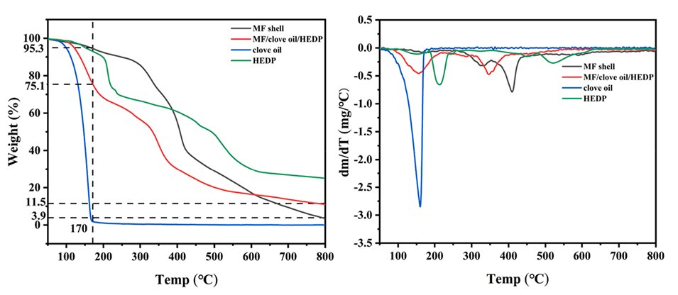图5.(a) HEDP、丁香油、MF壳和MCH微胶囊的热重分析(TGA)和差示热分析(DTG)曲线。