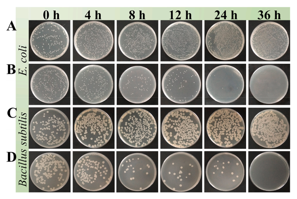 图8.不同时间间隔下MCH微胶囊对大肠杆菌和枯草芽孢杆菌的杀灭测试:(A,C)没有MCH微胶囊的空白组,(B,D)含有MCH微胶囊的样品组。
