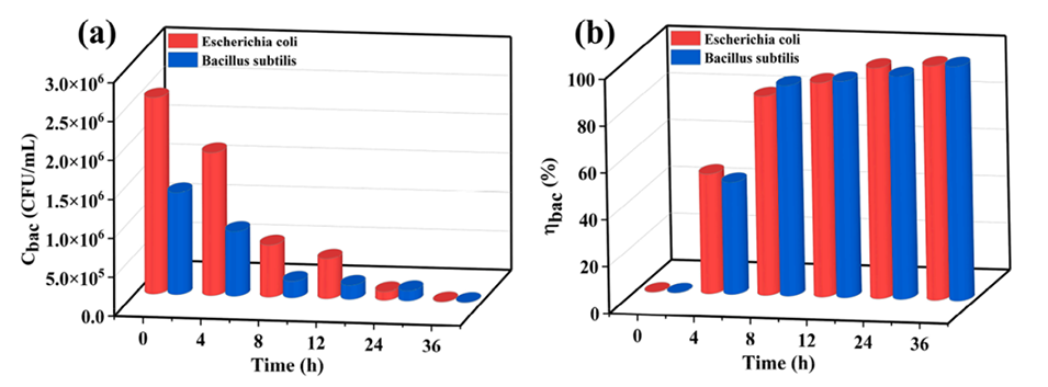 图9.(a)细菌溶液浓度和(b)抑菌率的变化。