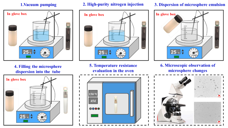 2、通过优化乳化剪切时间、单体浓度、DMA与NaSS质量比以及DVB用量,成功制备出可在150°C下于不同盐水(包括海水)中保持45天长期稳定性的PNS微球。其耐温耐盐性能显著优于传统聚丙烯酰胺微球。