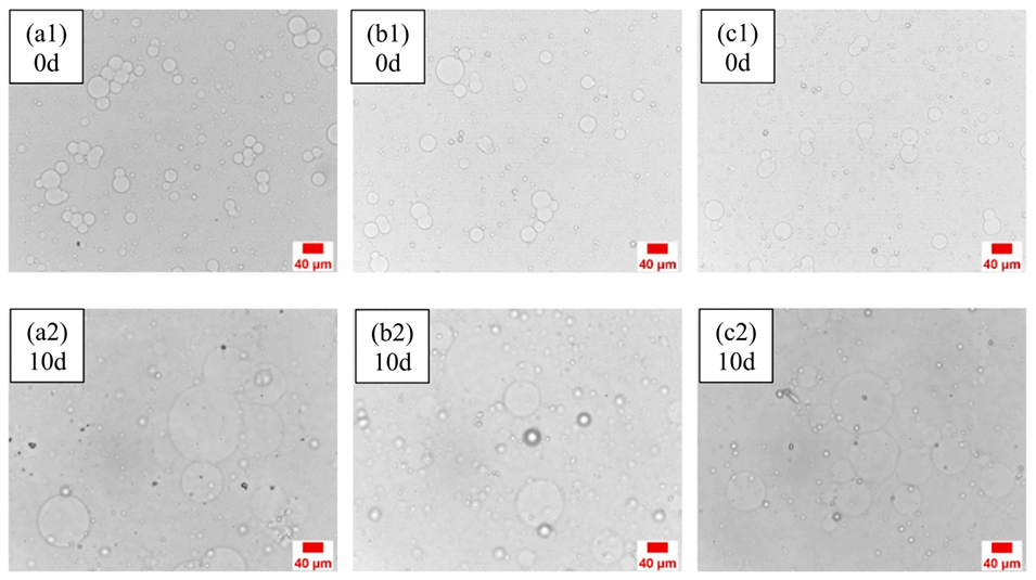 图7.不同单体组成比的聚合物微球在150℃下放置10天前后的显微观察结果。(a1,a2)DMA:NaSS=9.75:0.25;(b1,b2)DMA:NaSS=9.5:0.5;(c1,c2)DMA:NaSS=9:1(盐水为K油田模拟地层水)。