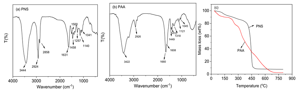 图9.(a)PNS的FT-IR光谱;(b)PAA的红外光谱;(c)PNS和PAA的TG分析结果。