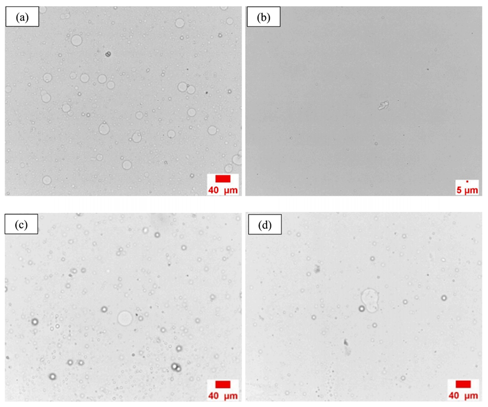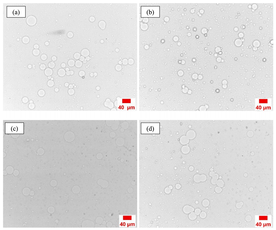 图10.(a)PAA微球在海水中0小时;(b)PAA微球在海水中45天后;(c)PAA微球在K油田模拟地层水45天后;(d)B油田的PAA模拟了45天后(120℃)的地层水。