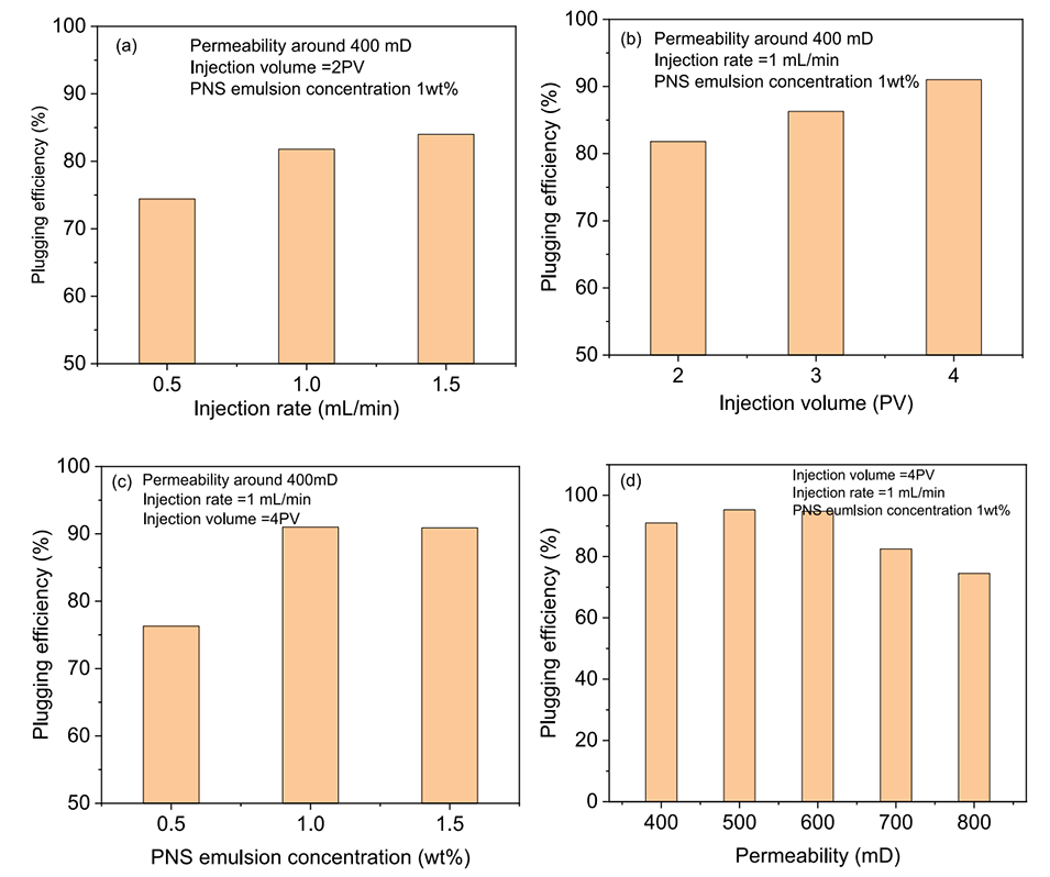 图14.(a)注入速率,(b)注入体积,(c)PNS乳液浓度,(d)多孔介质渗透率对PNS微球封堵性能的影响(注:渗透率是用水测量的)。