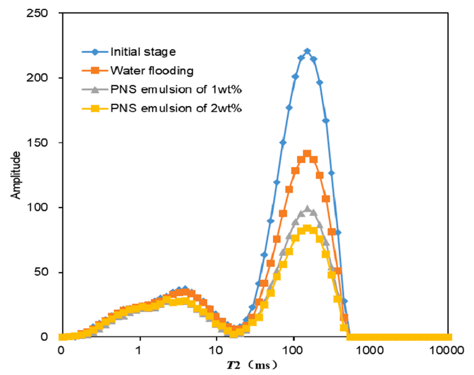 5、核磁共振(NMR)T2谱显示其能有效封堵大孔喉,实现微观流体转向,驱油实验表明采收率可提高约20%。该研究为海上高温非均质油藏调剖提供了一种可行的候选材料。