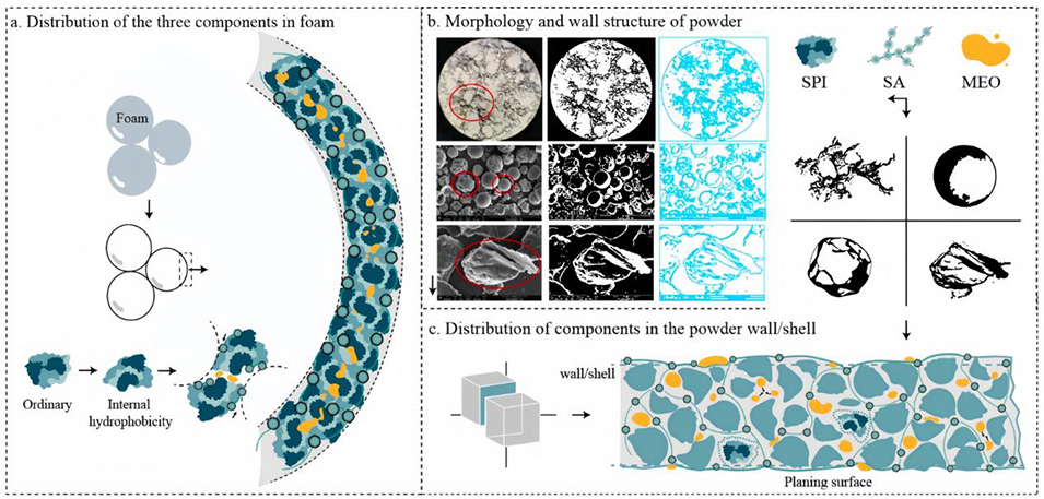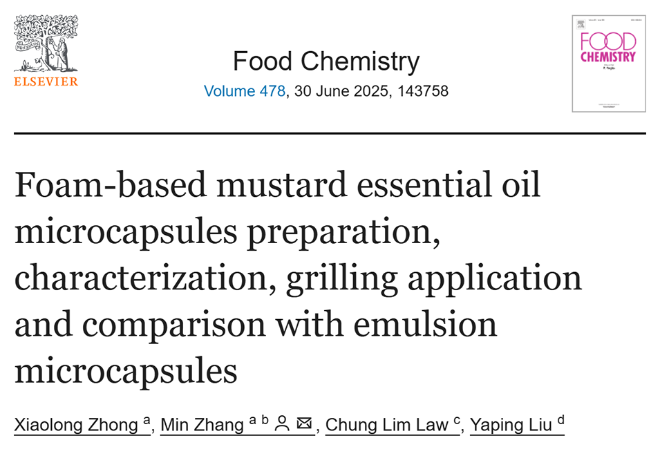 微胶囊化技术被广泛应用于食品、制药等行业以提高活性成分的稳定性,但泡沫模板化作为一种新兴的微胶囊化技术,其优势尚未被充分挖掘。近期,江南大学食品学院张慜教授团队以少量芥末精油(MEO)的封装为例,通过制备发泡量高的蛋白质(大豆分离蛋白)和多糖(海藻酸钠)乳液体系,收集泡沫并干燥(热风干燥和冷冻干燥),评估泡沫基和乳液基MEO微胶囊之间的理化性质差异。相关研究以“Foam-based mustard essential oil microcapsules preparation, characterization, grilling application and comparison with emulsion microcapsules”为题目,发表在期刊《Food Chemistry》上。