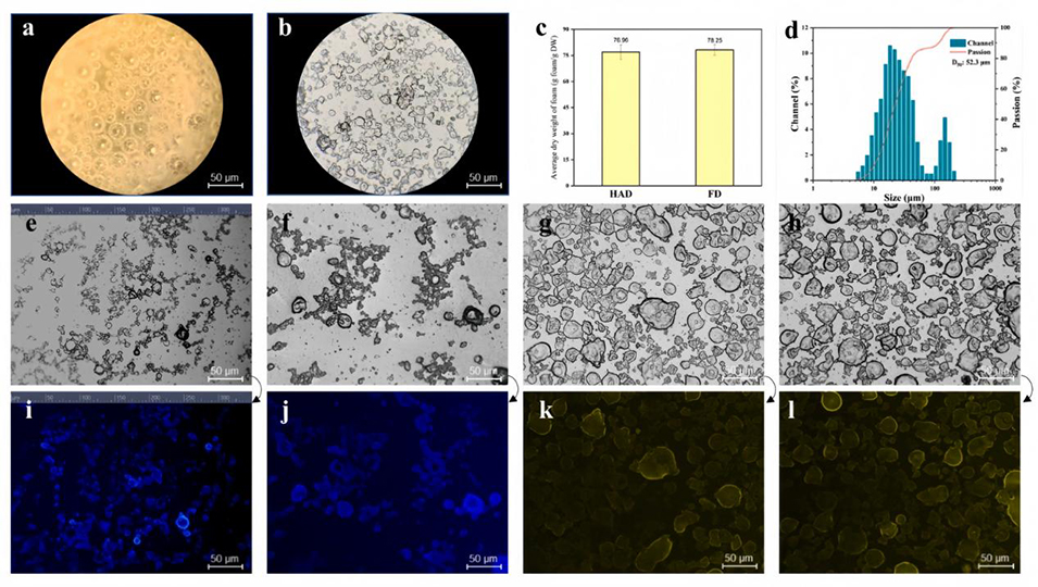图1.光学显微镜下泡沫的显微照片(湿,a),(干,b),明场(e-h),荧光场(i-l);两种干燥方式下泡沫的平均干重(c);泡沫的平均粒径和分布(d)。