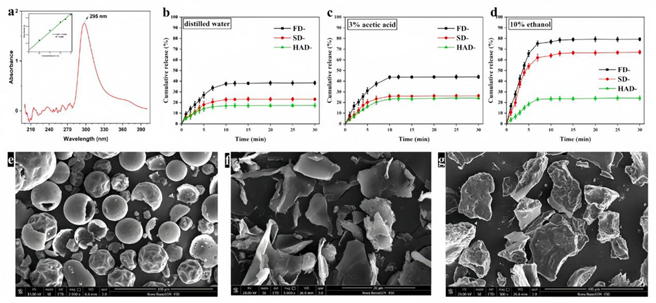图2.(a)芥末精油(MEO)在200-400nm范围内的UV-Vis光谱;(b-d)喷雾干燥(SD−,基于乳液),冷冻干燥(FD−,基于泡沫)和热风干燥(HAD−,基于泡沫)微胶囊在不同介质中的释放特性:(b)去离子水,(c)3%(v/v)乙酸,(d)10%(v/v)乙醇;(e-g)SEM照片(放大倍率:×2000)。