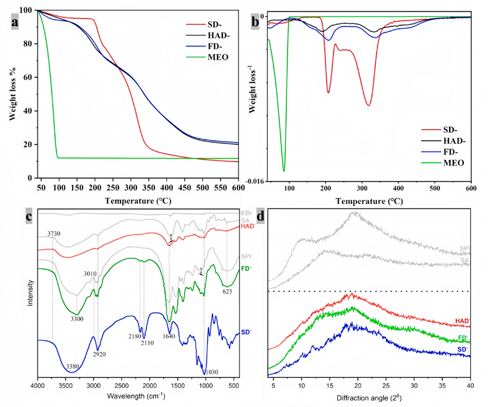 图3.(a)微胶囊的热重分析(TGA)与(b)导数热重(DTG)曲线;(c)傅里叶变换红外光谱图(FT-IR);(d)X射线衍射(XRD)图谱(2θ范围:4°-40°,Cu Kα辐射)。