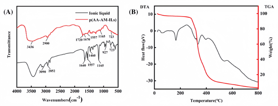 图3.(A)离子液体交联剂和P(AA-AM-ILs)凝胶微球在4000-500 cm-1范围内的FTIR光谱。(B)离子液体交联剂的热重分布。