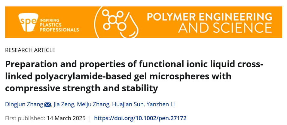 聚丙烯酰胺基凝胶微球的抗压强度低,热稳定性相对较差,这使得它们容易受到机械应力损伤,在高温环境中容易降解或溶解,从而限制了其在此类条件下的应用。近期,兰州理工大学张定军教授团队通过引入咪唑基离子液体交联剂,成功制备了一种具有显著增强压缩强度和热稳定性的聚丙烯酰胺基凝胶微球,为解决传统聚丙烯酰胺基凝胶微球在高温环境下的应用瓶颈提供了新思路。相关研究以“Preparation and properties of functional ionic liquid cross-linked polyacrylamide-based gel microspheres with compressive strength and stability”为题目,发表在期刊《Polymer Engineering and Science》上。