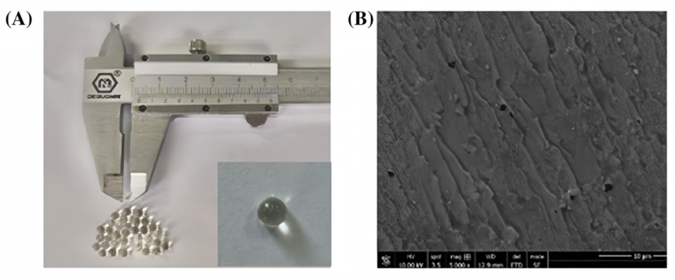 图5.(A)P(AA-AM-ILs)凝胶微球的数码照片。(B)P(AA-AM-ILs)凝胶微球的SEM图像。