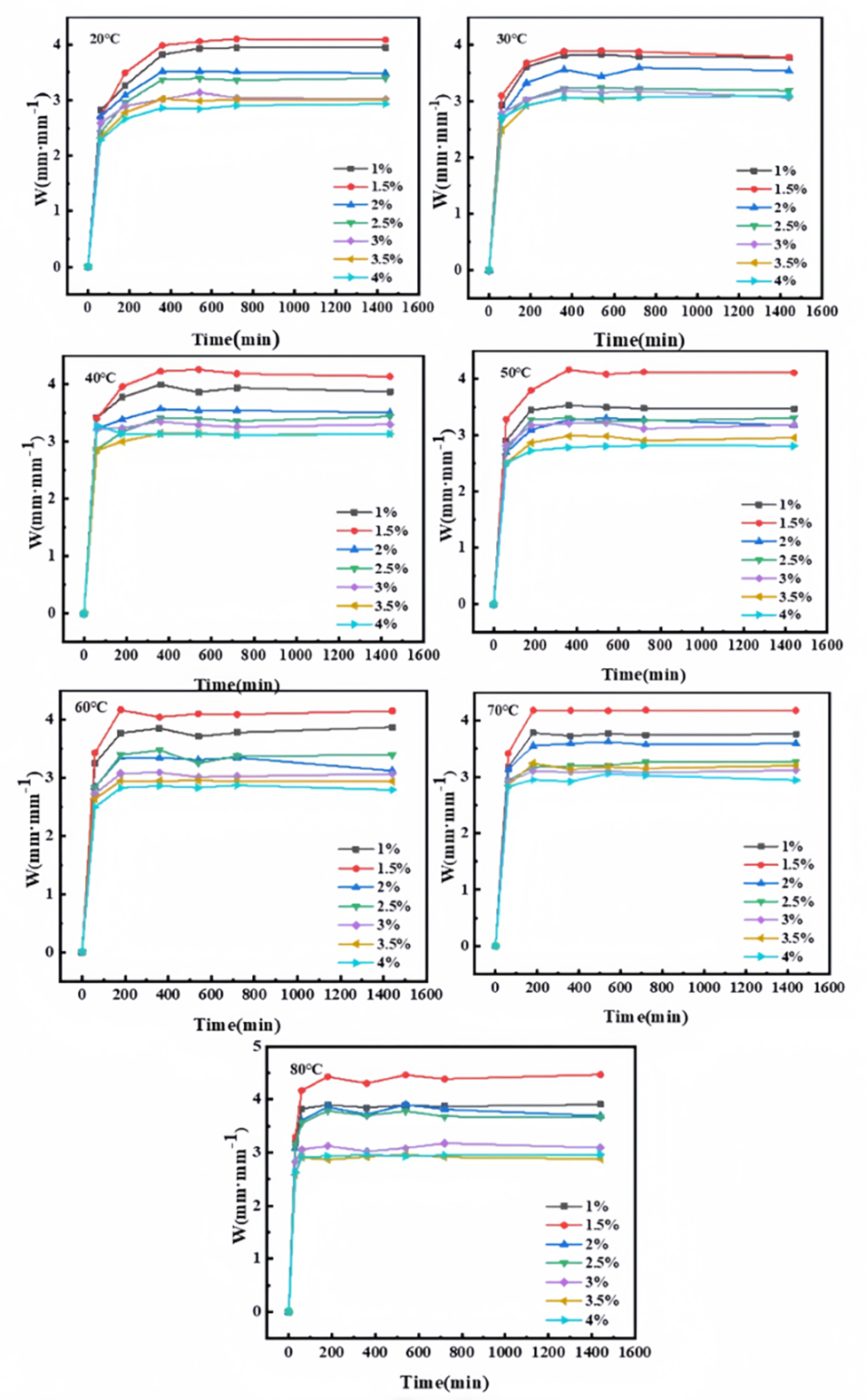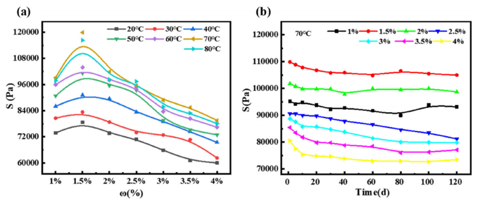 3、研究发现,当离子液体交联剂含量为15%时,凝胶微球的吸水率在不同温度下均超过3.5 mm mm-1,且在70℃下浸泡120天后,压缩强度仍保持在110 kPa,表现出优异的耐老化性能。