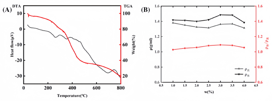 图6.(A)P(AA-AM-ILs)凝胶微球的热重分布。(B)离子液体交联剂含量与P(AA-AM-ILs)凝胶颗粒密度的关系图。