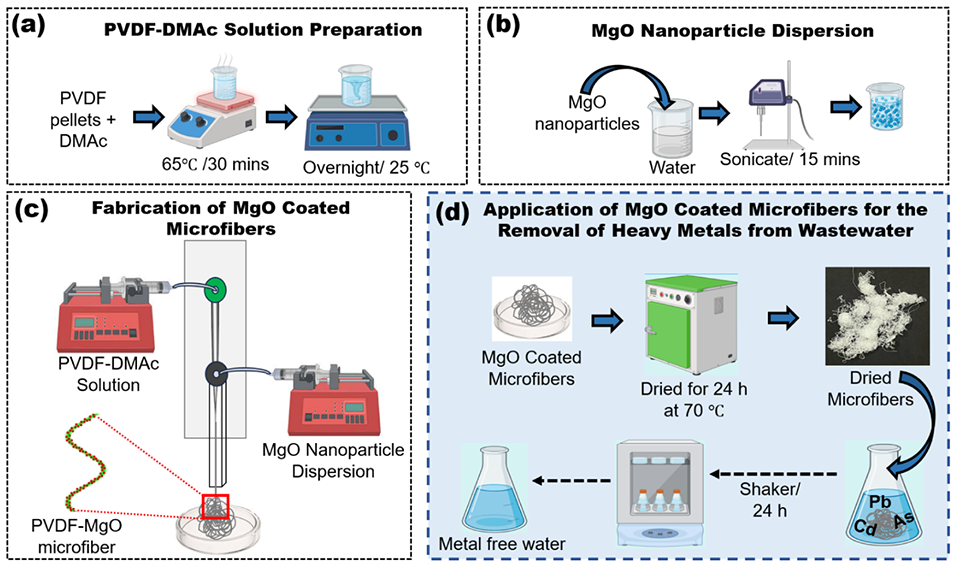 图1.涉及MgO纳米颗粒涂覆PVDF纤维的制备和测试的方案示意图:(a)聚合物溶液的制备。(b)纳米颗粒分散液的制备。(c)纳米颗粒涂覆聚合物纤维的微流控制备方法。(d)使用制备的纤维去除废水中的重金属。
