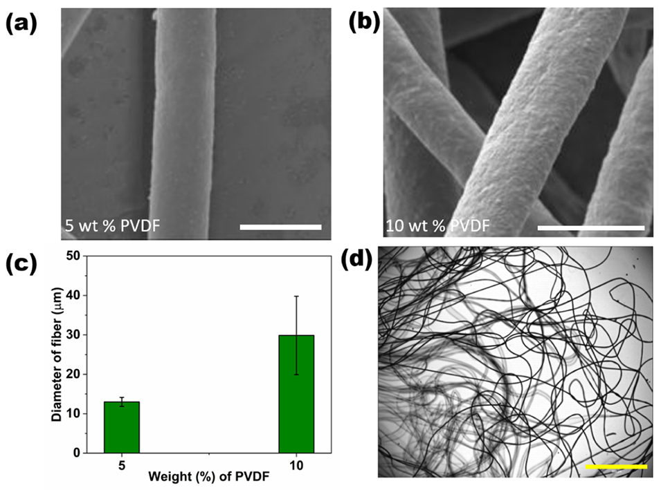 图3.在多种聚合物浓度下连续生产微纤维。使用不同浓度的PVDF(a)5wt%;比例尺:20μm,(b)10wt%;比例尺:50μm,(c)5wt%和10wt% PVDF纤维的直径,(d)5wt% PVDF微纤维批量生产的显微图像。所有情况下内外流速均保持在0.5和250mL/h。