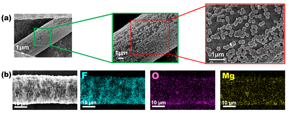 图5.通过扫描电子显微镜(SEM)和能量色散谱(EDS)确认MgO纳米颗粒在PVDF微纤维表面的均匀沉积。(a)PVDF微纤维的扫描电子显微镜图像,显示MgO纳米颗粒的均匀涂覆,(b)纤维表面的EDS映射显示F、Mg和O的存在和分布。这些纤维由5wt% PVDF在0.5和250mL/h的内外流速下制备而成。