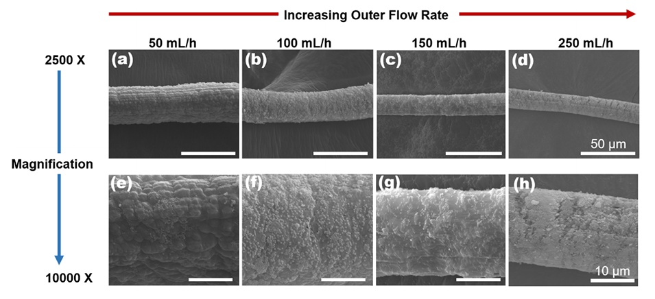 图4.外部流速对5wt% MgO纳米颗粒涂覆PVDF微纤维直径的影响,该微纤维使用0.5 mL/h的恒定内部流速和50至250 mL/h的变化外部流速合成。2500×(a−d)和10000×(e−h)放大倍率下的扫描电子显微镜图像。外层液体为水相MgO纳米颗粒分散液。