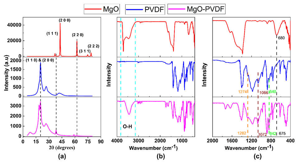 图6.(a)MgO纳米颗粒、PVDF纤维和MgO纳米颗粒涂覆PVDF纤维的X射线衍射(XRD),(b−c)傅里叶变换红外光谱(FTIR)。