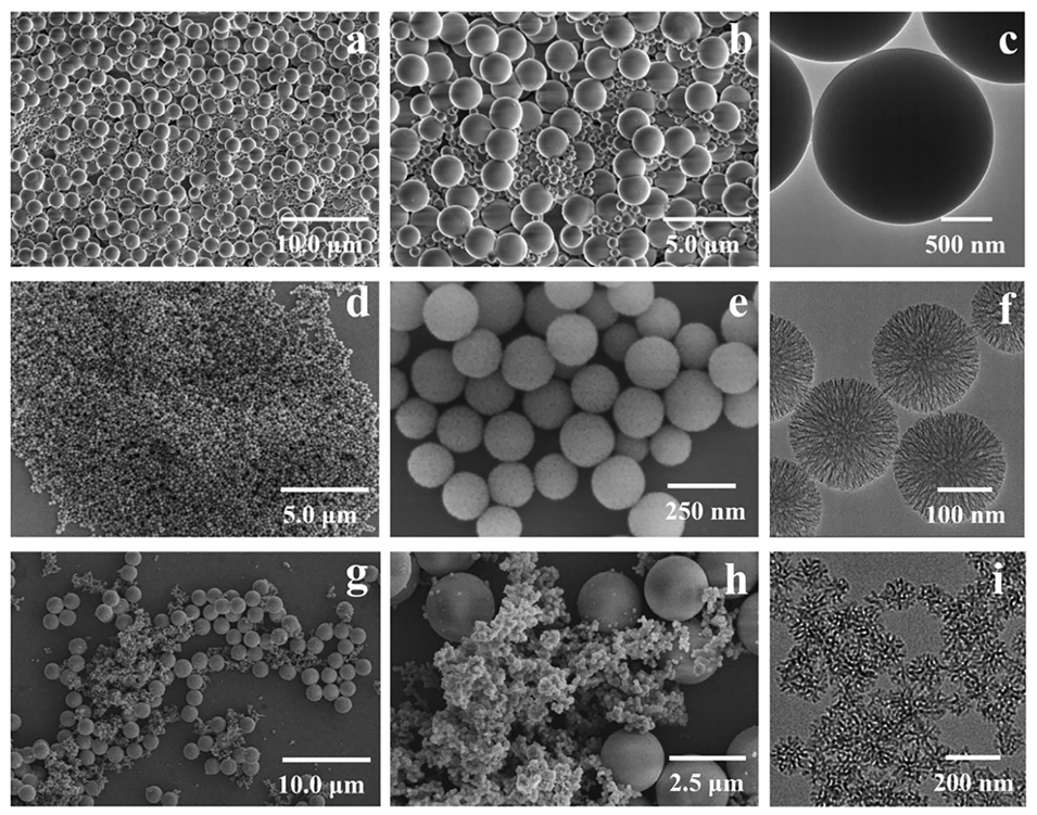 图2.不同体系制备二氧化硅球的SEM与TEM图像:(a-c)纯水体系;(d-f)甲苯-水双相体系(未添加非多孔二氧化硅核);(g-i)乙醇-水体系。