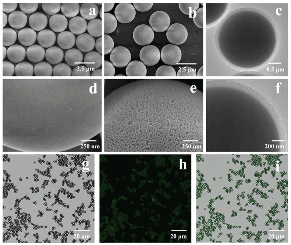 图1.(a,d)非多孔SiO2和(b,c,e,f)SiO2@SiO2-vinyl微球的a,b,d,e)SEM和c,f)TEM图像。SiO2@SiO2-CQDs的CLSM(g)明场、(h)荧光和(i)叠加图像。