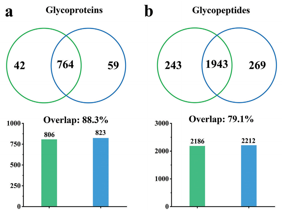 图6.不同加载和洗脱时间下鉴定的(a)糖蛋白和(b)糖肽对比。绿线:加载1分钟,洗脱1分钟;蓝线:加载30分钟,洗脱30分钟。材料,15mg SiO2@SiO2-GSH;大鼠肝脏酶解液,300μg。