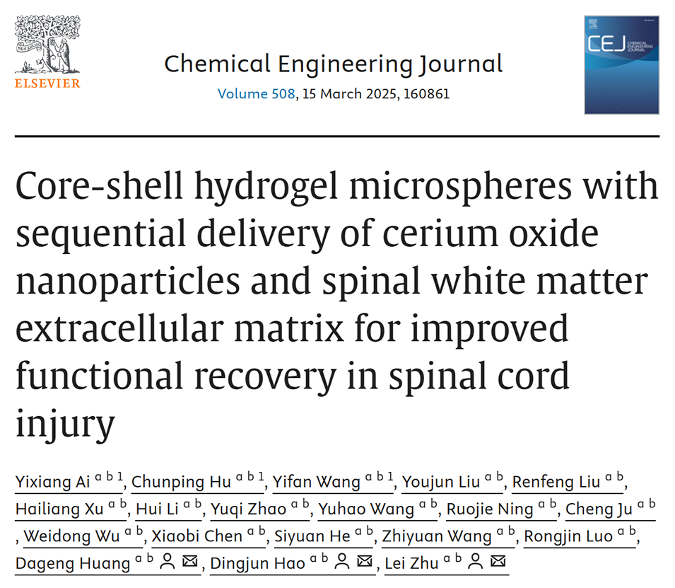 近期,西安交通大学附属红会医院郝定均教授、黄大耿副主任医师、朱雷副主任医师等人开发了一种核壳结构的水凝胶微球(PC-GEN),用于脊髓损伤(SCI)治疗。该微球通过序贯释放氧化铈纳米颗粒(CONPs)和脊髓白质细胞外基质(swm-ECM),在缓解早期炎症的同时促进神经再生,显著改善了SCI大鼠的功能恢复。相关研究以“Core-shell hydrogel microspheres with sequential delivery of cerium oxide nanoparticles and spinal white matter extracellular matrix for improved functional recovery in spinal cord injury”为题目,发表在期刊《Chemical Engineering Journal》上。