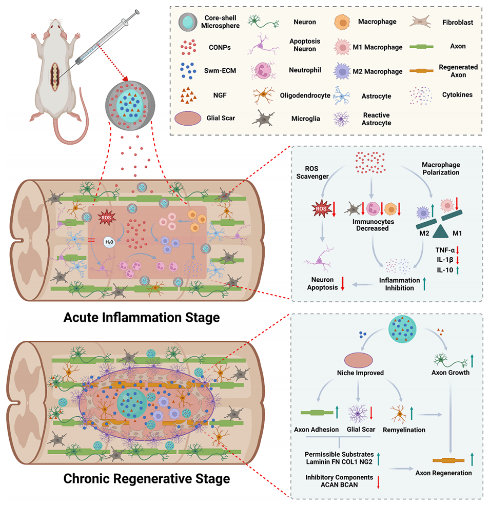 Scheme 1:核壳微球PC-GEN在T10脊髓损伤中的生物机制示意图。在急性炎症阶段,壳层释放的CONPs通过清除活性氧(ROS),减少炎症反应,并促进巨噬细胞/小胶质细胞向抗炎的M2表型极化,从而降低神经元凋亡。在慢性再生阶段,核心释放的swm-ECM调节胶质瘢痕周围的ECM沉积,促进轴突粘附和髓鞘再生。NGF激活神经元的内在生长能力,并与swm-ECM协同作用以增强轴突再生。