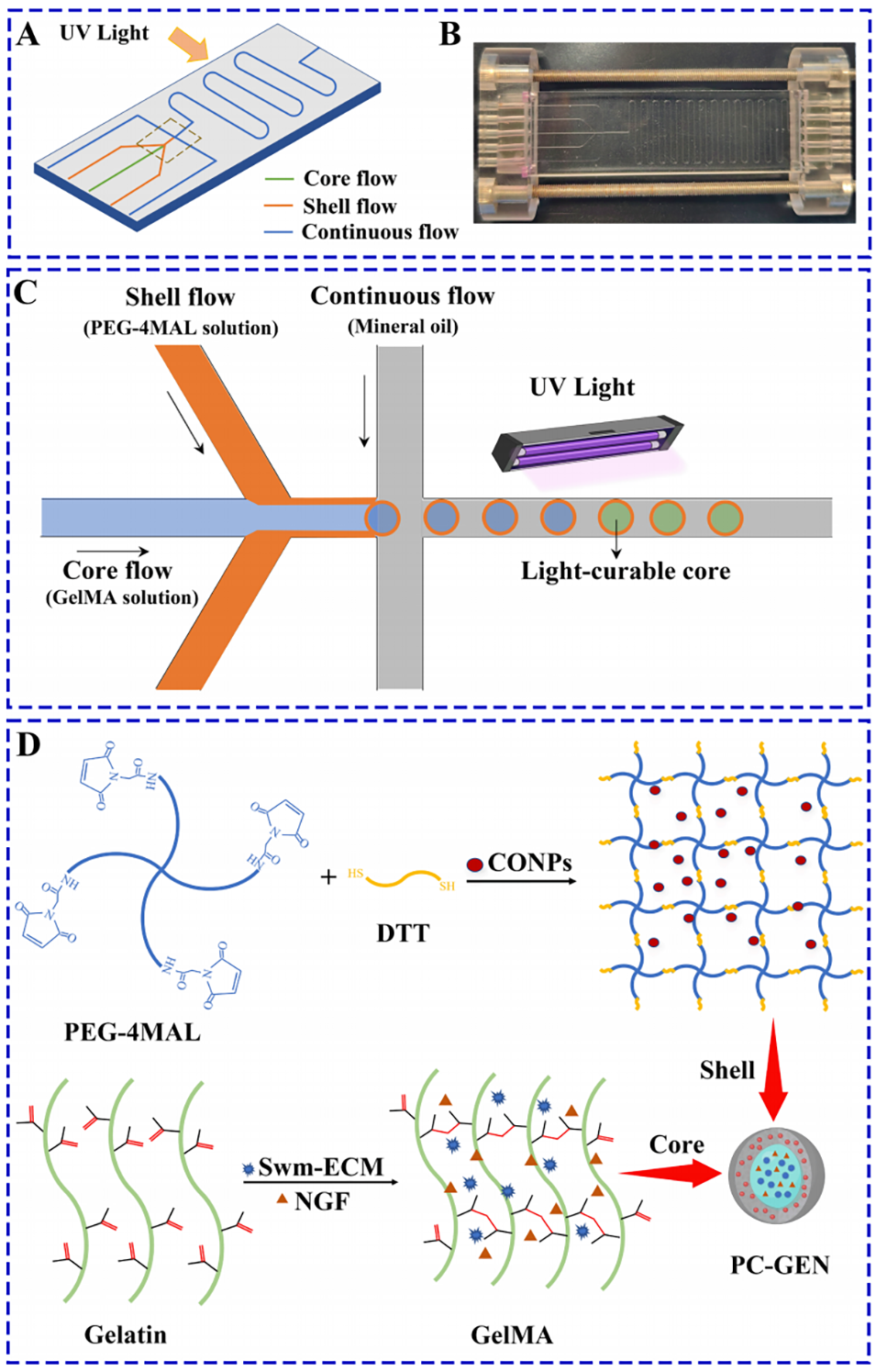 核心流通道:注入GelMA核心溶液。