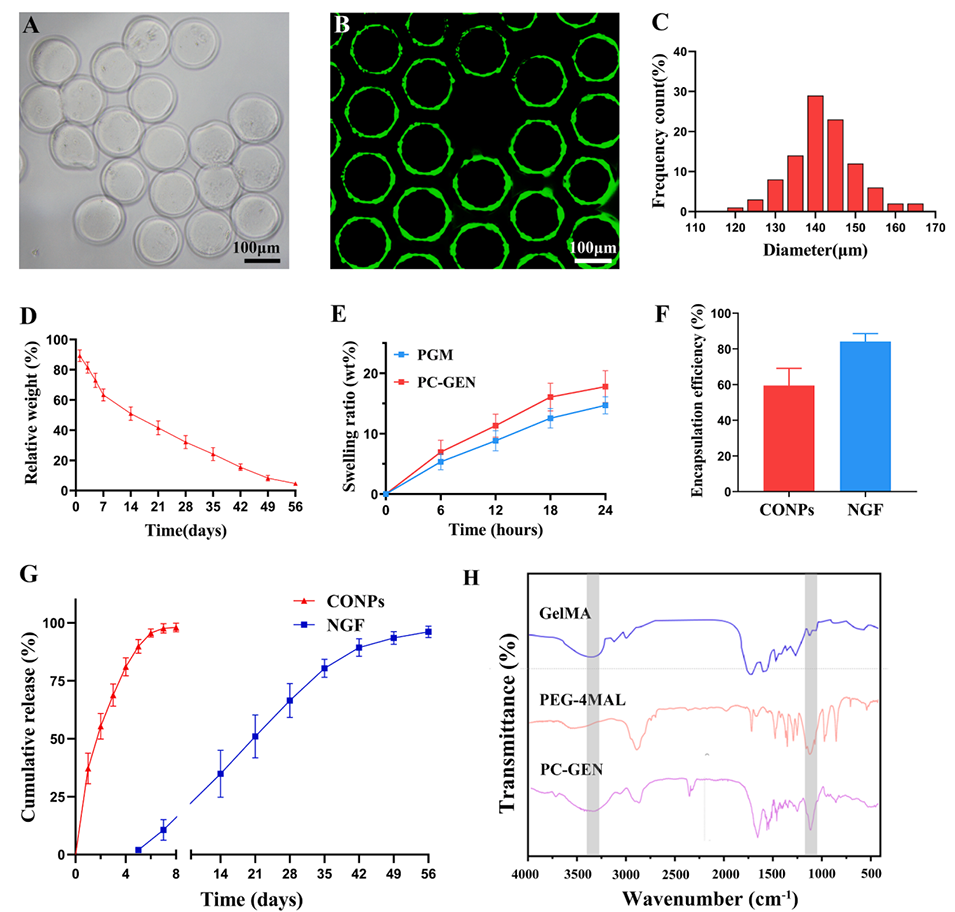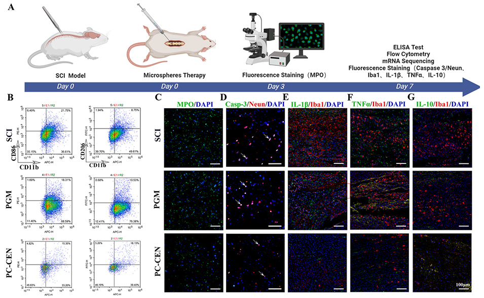 1、本研究开发了一种基于液滴微流控技术的核壳结构水凝胶微球(PC-GEN),用于脊髓损伤(SCI)的分阶段治疗。