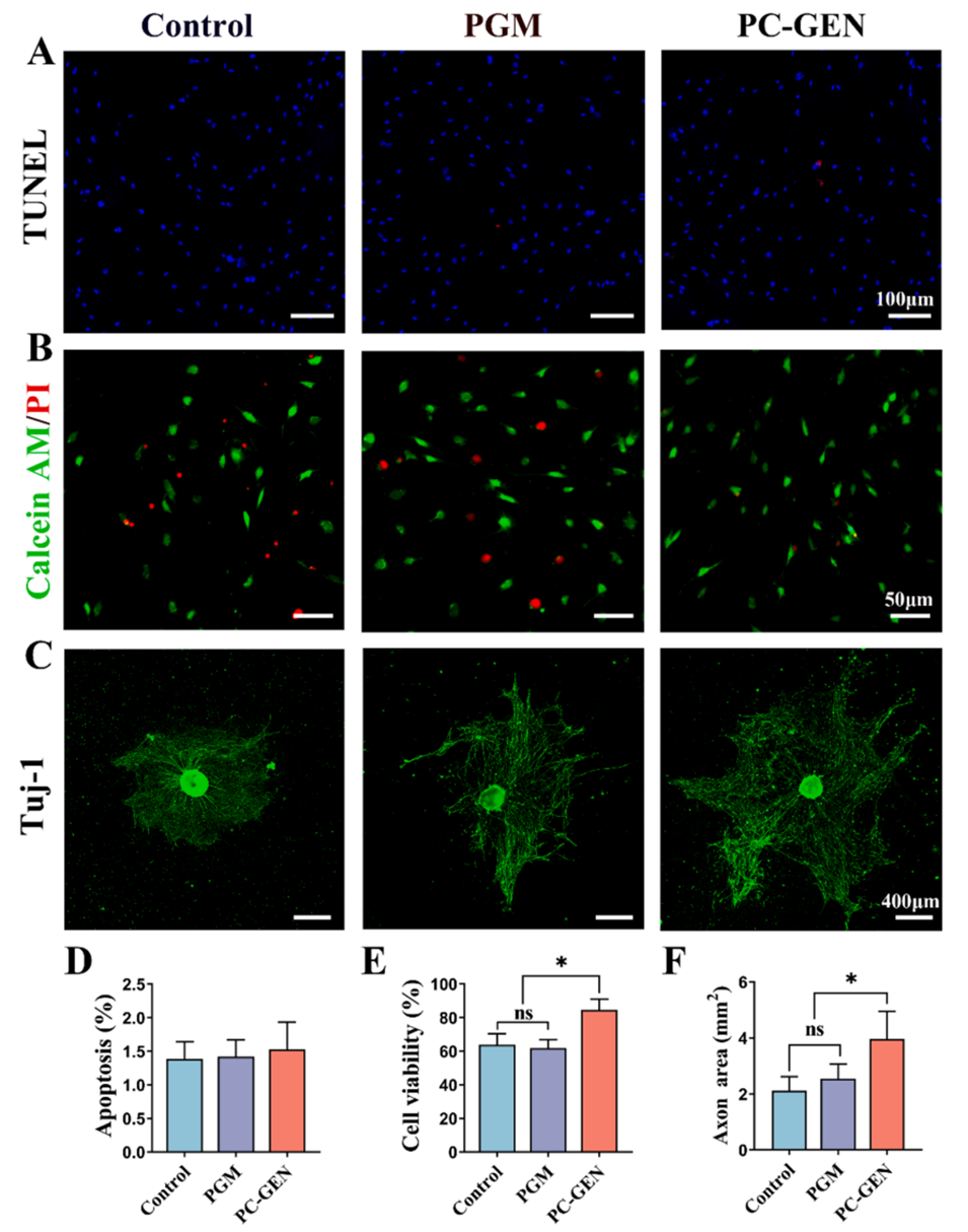 图3:PC-GEN表现出良好的生物相容性,降低了活性氧(ROS)水平,增强了轴突生长。