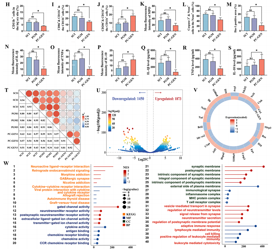 图4:PC-GEN在脊髓损伤后的抗炎和神经保护作用。PC-GEN减少了炎症细胞的浸润,调节了巨噬细胞/小胶质细胞的极化,并降低了炎症水平和凋亡。